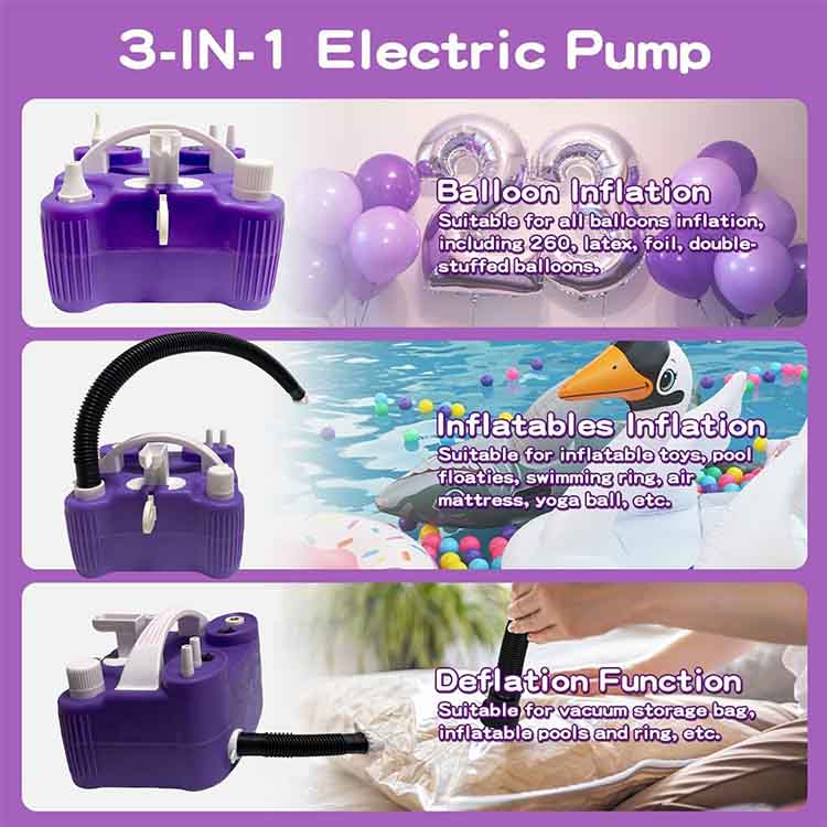 Pump Balloon Elektrik iki nawakake papat fungsi ing One.it ora mung inflator balon sing efisien, nanging uga minangka inflasi balon sing efisien banget kanggo pompa vakum sing cerdas kanggo bal udara vakum, lan pompa udara profesional kanggo bal olahraga. Saka hiasan pesta menyang kemah ruangan, saka panyimpenan omah menyang olahraga lan fitness, siji piranti kalebu kabeh kabutuhan pemandangan, ngirit ruang lan nyimpen anggaran.