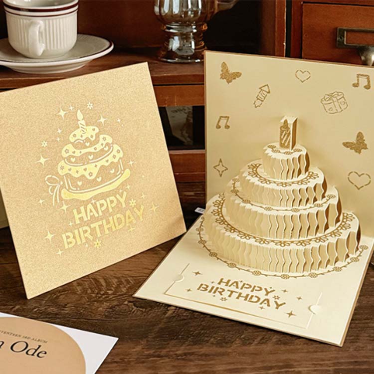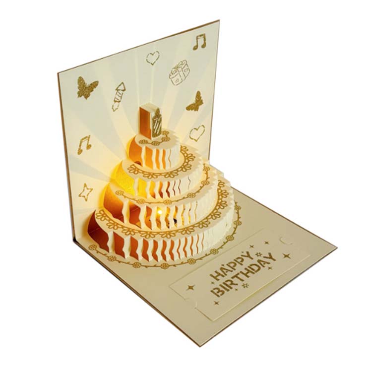 Tutup kertu ulang tahun 3D digawe kanthi proses embossing berwarna. Interior kasebut nampilake desain kue 4 lapisan, lan kertu ucapan cilik ditambahake kanggo pesen ucapake.