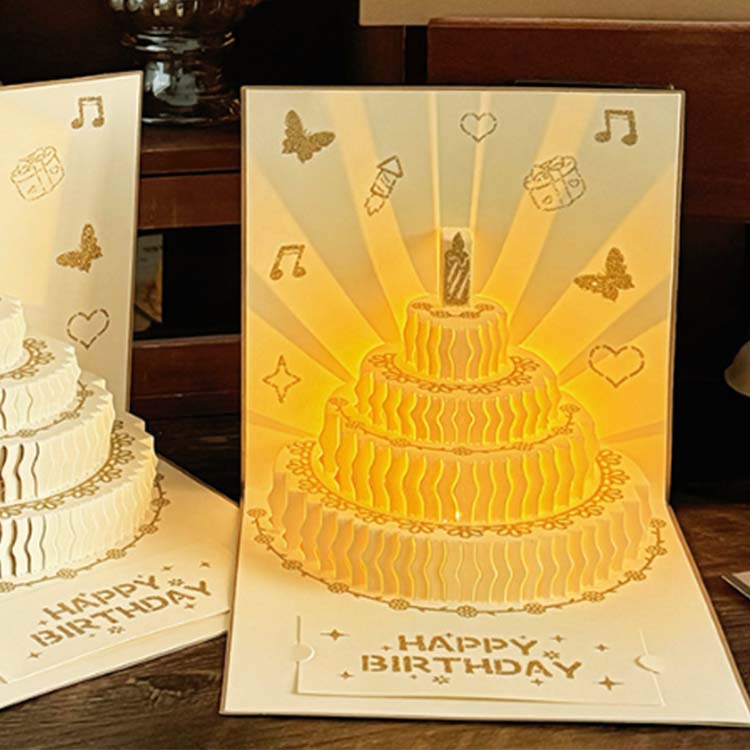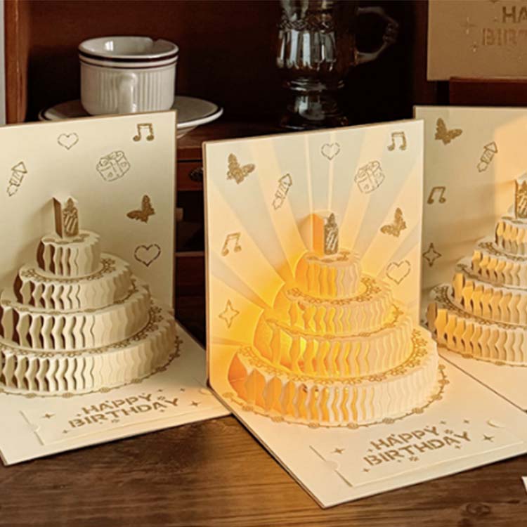 Kertu ulang tahun 3D ngemot komponen elektronik, nampilake lampu lan efek musik. Gampang digunakake.