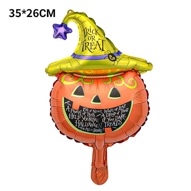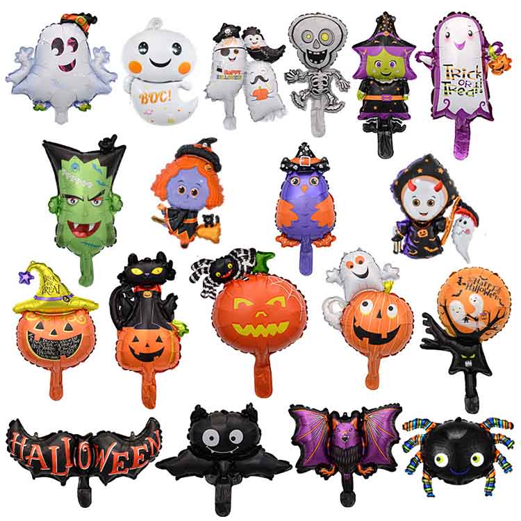 Balon film aluminium iki nyawiji unsur halloween klasik kayata tengkorak, lantern waluh, bats, laba-laba, bentuk kartun sing lucu lan sithik. Ukuran Mini bisa nggawe atmosfer sing kuat manawa digantung mung utawa diselehake ing kombinasi.