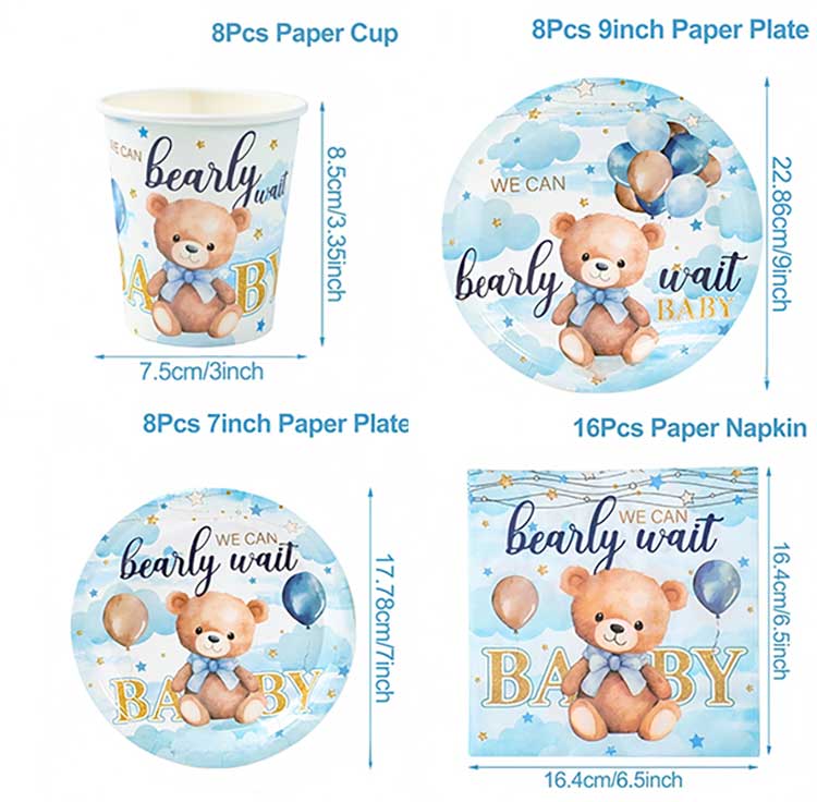 Ukuran set piring ulang tahun bayi: Produk kasebut dikemas ing tas OPP, nanging kemasan kertu kertas uga kasedhiya. Kita bisa ngatur kemasan miturut syarat khusus pelanggan.