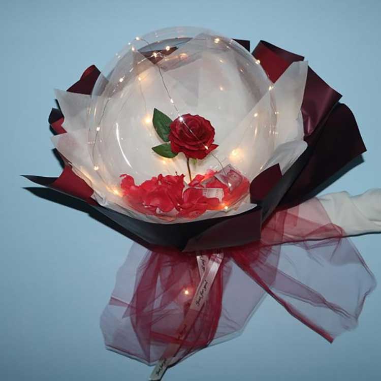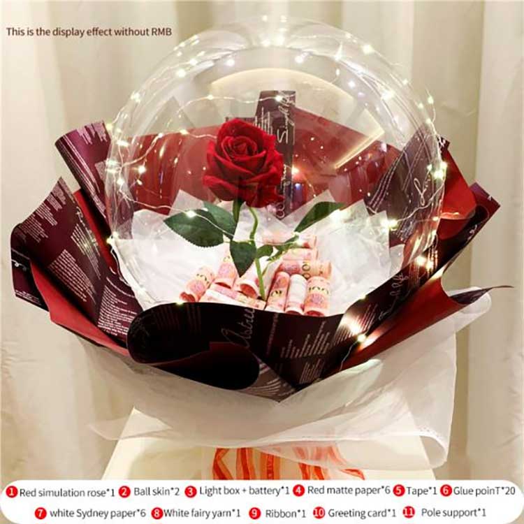 Balon BOBOiku atmosfer luar biasa:Nampilake balon BOBO transparan, mawar sing dipasang, lan lampu LED, set kasebut nggawe efek visual sing padhang lan romantis. Lampu LED uga nyedhiyakake cemlorot sing alus, dadi hadiah penting kanggo Dina Valentine, ulang taun, ulang tahun, wisuda, lan Hari Ibu.