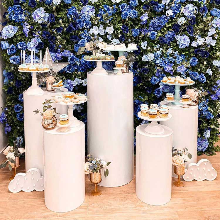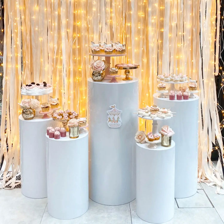 Tabel panganan cuci mulut silinder digawe saka logam lan bobote rada entheng. Padha kuat lan awet.Mulane, ora mung nyedhiyakake tekstur sing apik nanging uga ndadekake pangguna bisa ngatur. Minangka titik fokus upacara kasebut, dheweke bakal ninggalake kenangan sing apik lan rasa seneng kanggo saben peserta acara kasebut.