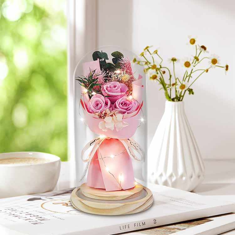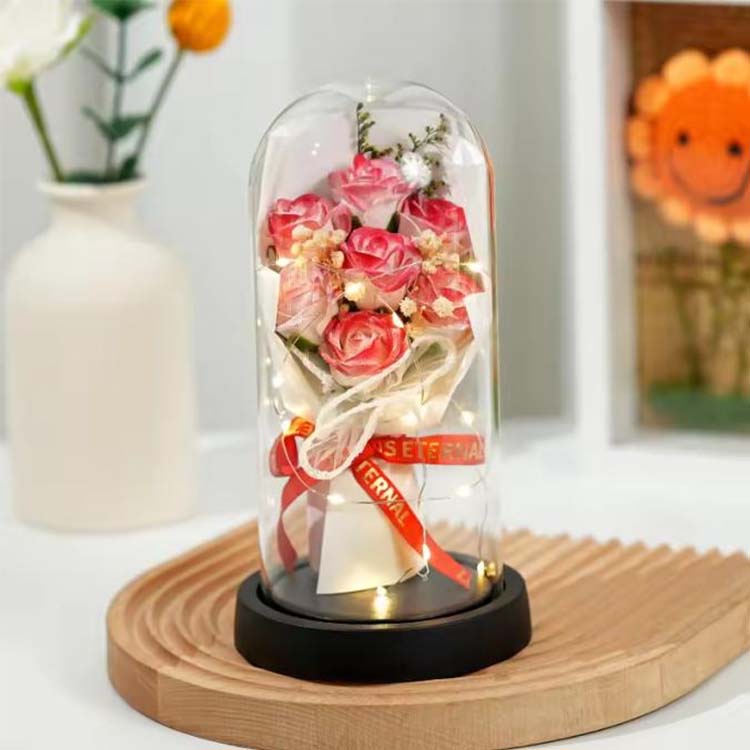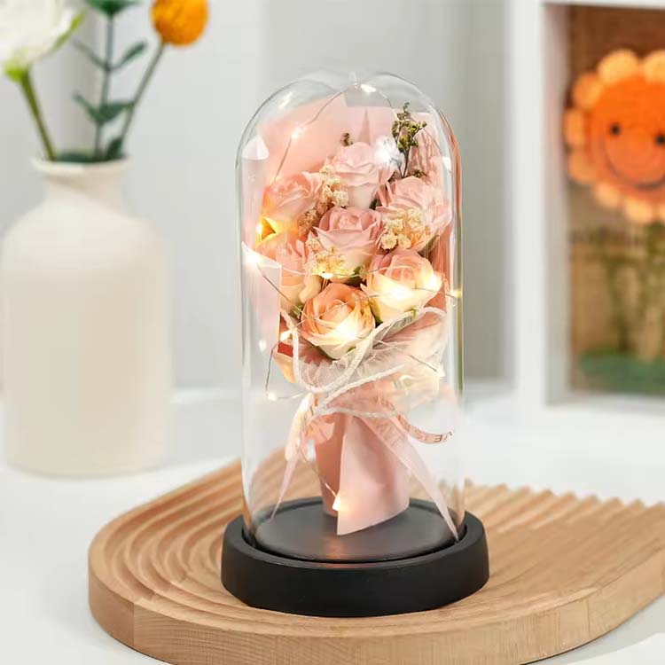 Bahan Coklat: We nawakake warna lan pvc shade karo soap mawar bouquet sing bisa uga bisa ditindakakemisi kanggo kabutuhan. Digawe saka kaca borosilicate, kembang buatan, lan kayu alami.