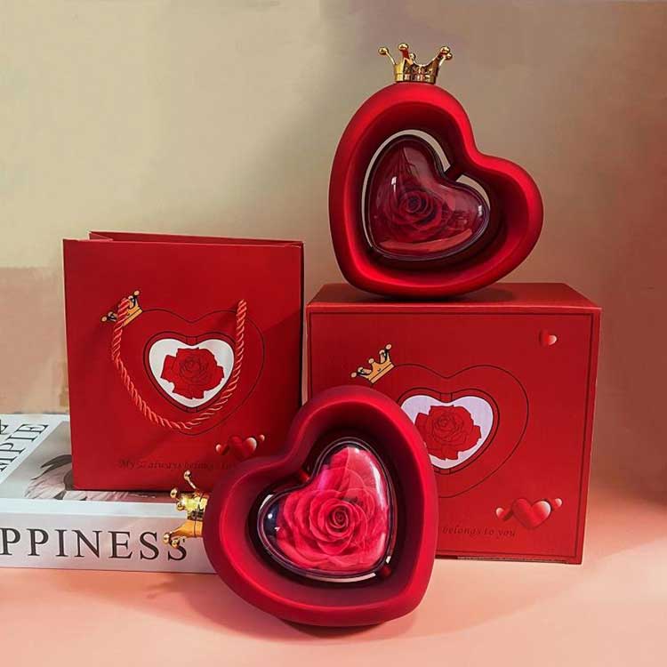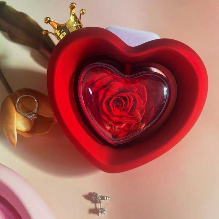 Kothak Perhiasan Mawar Bentuk Jantung nggunakake kembang sing diawetake kelas A, sing warna lan teksture ora bisa dibedakake karo kembang seger.