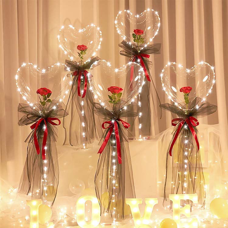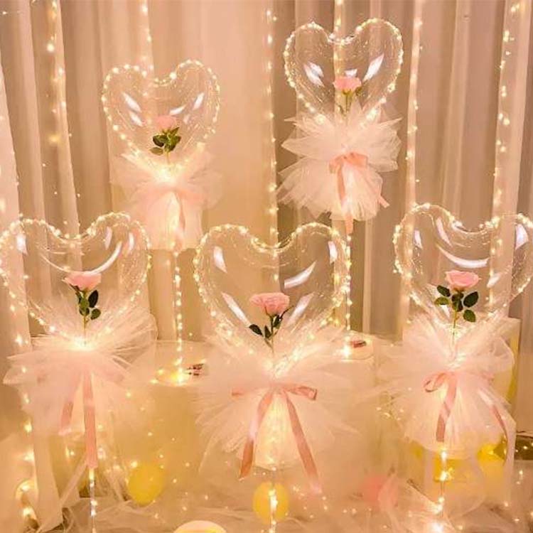 Aksesoris Dekorasi: Umumé,Bobo Mawar BOBO Ati Shapeddiiringi sawetara dekorasi, kayata benang renda, jalur cahya, pompa udhara, baterei, lsp. Renda kasebut bisa dibungkus ing bal bal lan wungu, nambah swasana sing mili lan romantis; Strip kasebut bisa ngetokake cahya sing alus ing wayah wengi utawa ing kahanan sing dimensi, nggawe kabeh luwih ngimpi lan narik kawigaten.