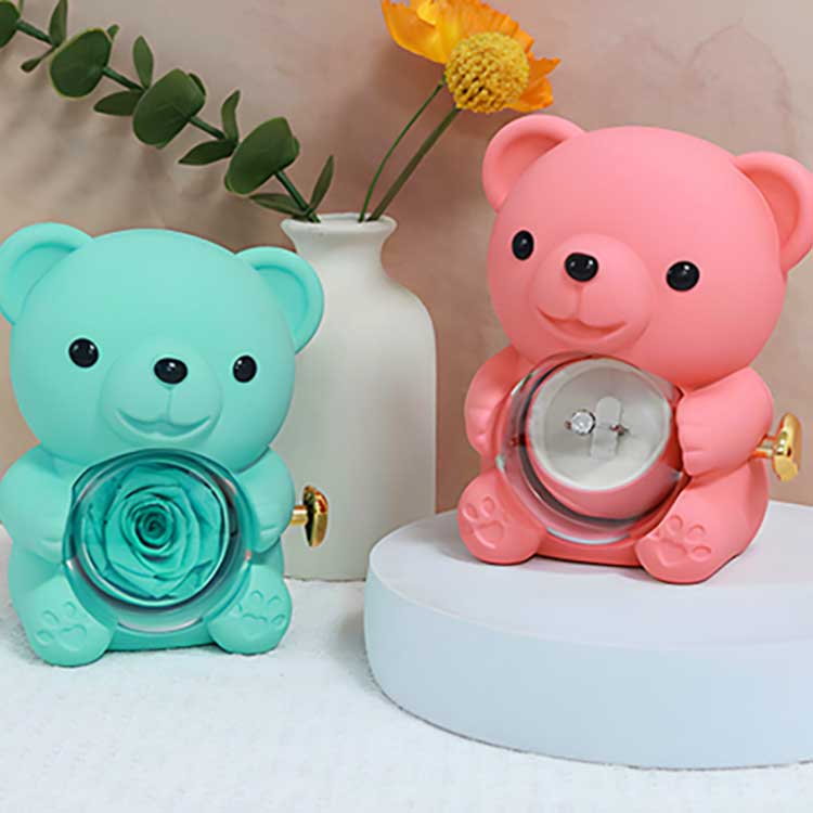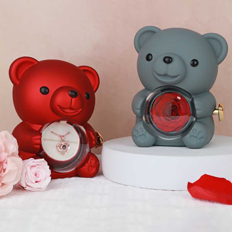 Kothak perhiasan Hug Bear Rose iki digunakake kanggo nampilake ing meja, rak buku, utawa meja bedside. Fitur sing paling nyenengake yaiku mawar sing diawetake ing tengah. Mbukak mawar mbukak kompartemen kanggo nyimpen perhiasan, dering, utawa kenang-kenangan.