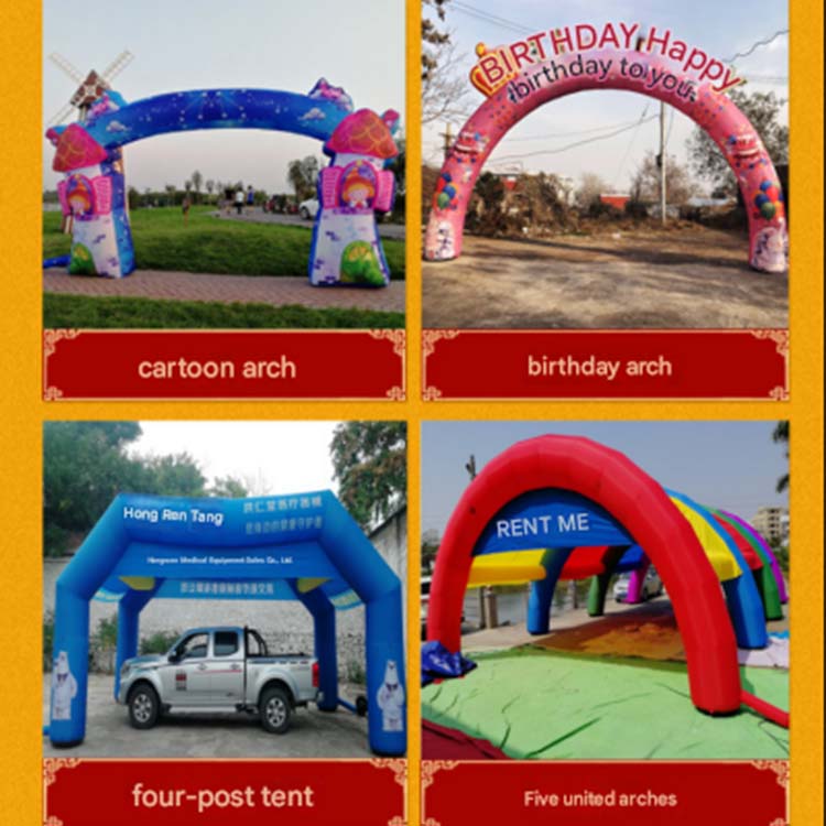 Digawe saka bahan sing bisa awet lan kasedhiya ing macem-macem bentuk lan warna, lengkungan inflatable iki kanthi cepet kanthi pompa lan tali sandbags lan tali kanggo gampang instalasi. Dheweke bisa dicithak ing tandha-tandha utawa ruang acara lan bisa digunakake maneh lan ekonomi. Dheweke pancen sampurna kanggo bukaan, pameran, pameran, acara sekolah, lan pesta.
