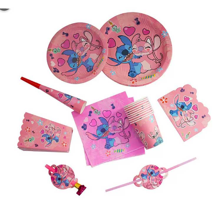 Set piring sekali pakai Stitch kalebu produk ing ngisor iki: piring 7 inci (10pcs / tas), piring 9 inci (10pcs / tas), serbet (20pcs / tas), umbul-umbul (10pcs / tas), tas hadiah bali (10pcs / tas), kothak popcorn (6pcs / tas), blowing dragons (6pcs / tas), topi kertas (6pcs / tas), (6pcs / tas), (6pcs/tas), sedotan (10pcs/tas), kartu undangan (10pcs/tas), masker (10pcs/tas), sendok, sendok garpu (10pcs/tas), lan taplak meja (1pc/tas). Set kasebut ngemot 17 jinis produk sing beda. Pelanggan bisa milih tuku kabeh set utawa mung milih bagean saka item kanggo nyukupi kabutuhan.